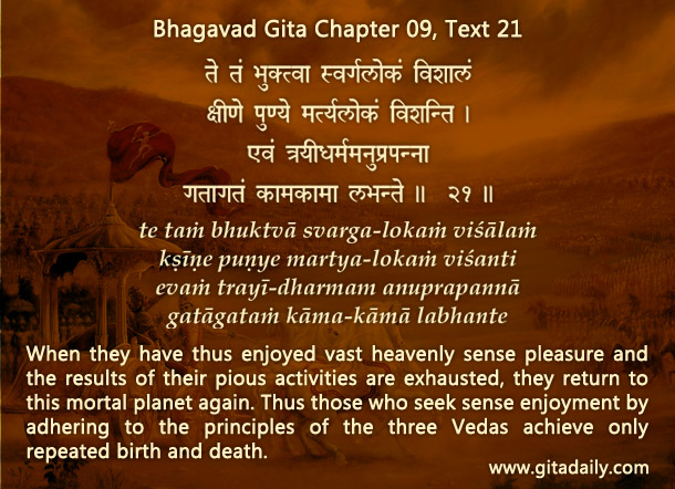 Pertinently, the Gita discusses people who practice mundane religious rituals and rise to heaven (09.20). But once their pious credits are exhausted, they fall back to earth. If they are again tempted by the good life of material piety, they gradually rise to heaven again and eventually fall back to earth again. Thus, they stay in the cycle of birth and death, lifetime after lifetime. (09.21)