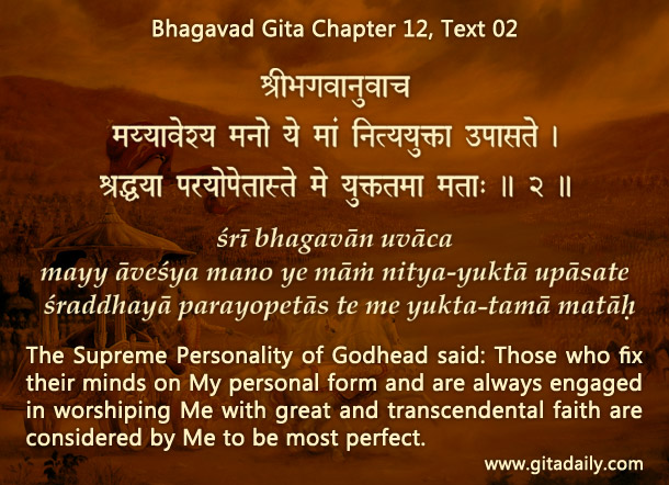 In the Gita (12.01), Arjuna asks: Who are most evolved in yoga – the devotees who worship Krishna or the impersonalists who seek the impersonal Absolute? In the next verse (12.02), Krishna answers that the devotees are the most evolved. He uses the superlative: yukta-tamo. Yukta is a variant of the word yoga – yukta refers to those engaged in yoga. Yukta-tara is the comparative form, like the English better. And yukta-tamo is the superlative form, like the English best. Thus, the Gita (12.02) declares that the most evolved yogis are the devotees.