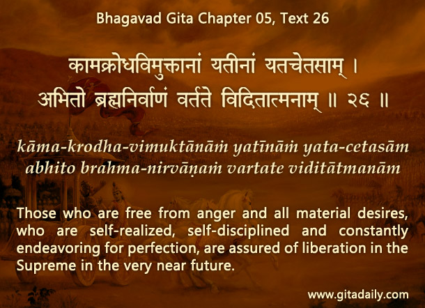 Moreover, remembering that we are meant to be cooperators, not controllers, can help us recover faster whenever we slip in our efforts to control our senses. When our self-worth comes from our self-control, we see such falls as life-destroying disasters, indulge in excessive self-recrimination and end up disheartened. But when we identify ourselves as servants of Krishna, we see such falls positively, as timely reminders of our indispensable need for Krishna’s shelter. Seeking that shelter, we intensify our devotional practices. Becoming purified, we progress towards full liberation, which, the Gita (05.26) indicates, involves freedom from not just desire but also anger.