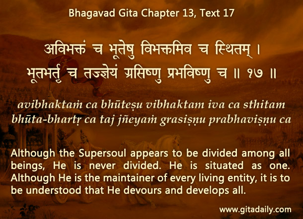 13.17 Although the Supersoul appears to be divided among all beings, He is never divided. He is situated as one. Although He is the maintainer of every living entity, it is to be understood that He devours and develops all.