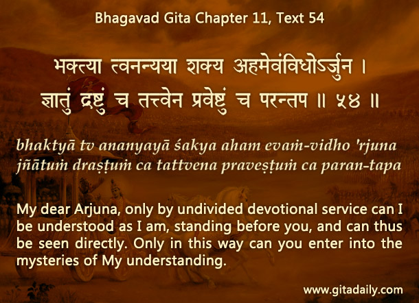 For understanding him, we need his descending revelation by which he makes himself accessible to us. Gita wisdom explains that God in his highest manifestation is an all-attractive supreme person, Krishna, who loves us and wants us to love him. When he is pleased by our sincere devotional intention and endeavor, he reveals himself to us by his omnipotent grace. The Bhagavad-gita (11.54) declares that Krishna can be known only through devotion – and preludes this with an assertion of the inadequacy of alternative methods (11.53).