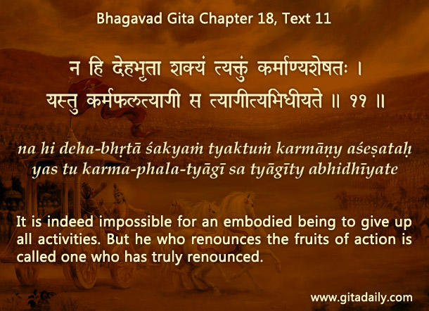 18.11 It is indeed impossible for an embodied being to give up all activities. But he who renounces the fruits of action is called one who has truly renounced.