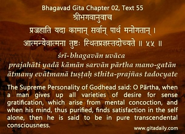 02,55 The Supreme Personality of Godhead said: O Pārtha, when a man gives up all varieties of desire for sense gratification, which arise from mental concoction, and when his mind, thus purified, finds satisfaction in the self alone, then he is said to be in pure transcendental consciousness.