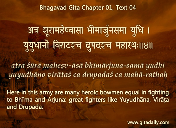 01.04: Here in this army are many heroic bowmen equal in fighting to Bhima and Arjuna: great fighters like Yuyudhana, Viraṭa and Drupada.