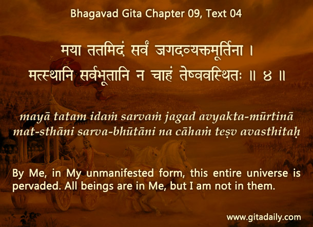 09.04 By Me, in My unmanifested form, this entire universe is pervaded. All beings are in Me, but I am not in them.