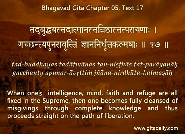 05.17 When one’s intelligence, mind, faith and refuge are all fixed in the Supreme, then one becomes fully cleansed of misgivings through complete knowledge and thus proceeds straight on the path of liberation.