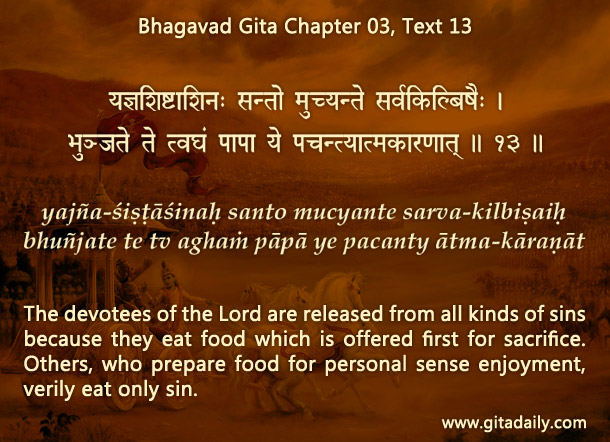 03.13 The devotees of the Lord are released from all kinds of sins because they eat food which is offered first for sacrifice. Others, who prepare food for personal sense enjoyment, verily eat only sin.