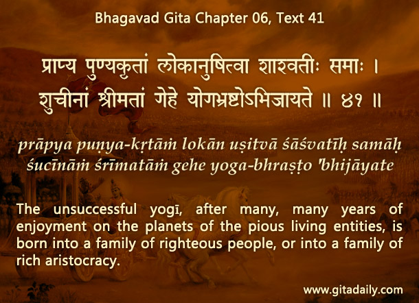 06.41 The unsuccessful yogī, after many, many years of enjoyment on the planets of the pious living entities, is born into a family of righteous people, or into a family of rich aristocracy.