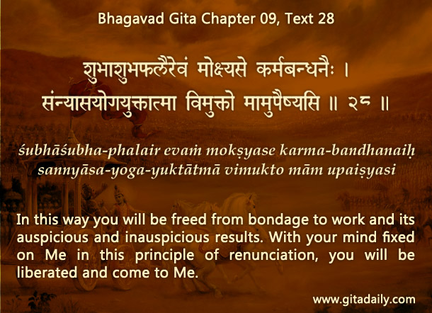 This giving aspect of devotion is conveyed in a three-verse sequence in the Bhagavad-gita (09.26-28) that describes the performance of bhakti-yoga at advanced and not-so-advanced levels. Advanced devotees offer Krishna their heart and their entire being. Even if constrained circumstances compel them to keep their practical offering very simple – a leaf, a flower, a fruit or just a little water – their mood of giving still pleases Krishna (09.26). Not-so-advanced devotees can cultivate that giving mood by offering to Krishna whatever work they do (09.27). If they steadily offer him the things dear to them at their level of consciousness, they gradually rise to life’s supreme perfection: eternal love for Krishna (09.28).