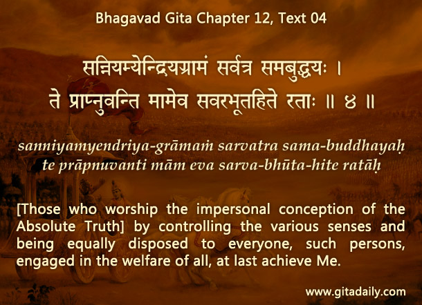 However, the Gita itself differentiates among impersonalists. It (09.11–12) declares that those impersonalists who minimize Krishna’s form as materia, known as Mayavadis, l are deluded and ill-fated. In contrast, it (12.03–04) indicates that those impersonalists who simply seek the impersonal Absolute, without condemning the personal, known as Brahmavadis, eventually attain their desire – but only after great labor (12.05).