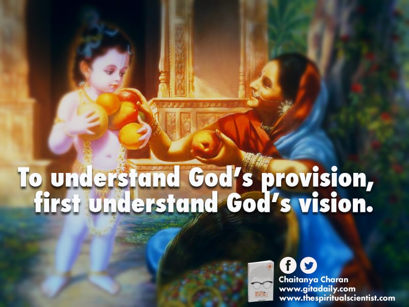 God shares his vision with us through scripture. The Bhagavad-gita expands our vision of ourselves beyond the temporary material body to the eternal spiritual essence – the soul. As we are eternal, we are meant for something far better than struggling for survival in a death-filled world or at best struggling for pleasure in a misery-filled world – which is what provision at the material level essentially boils down to.