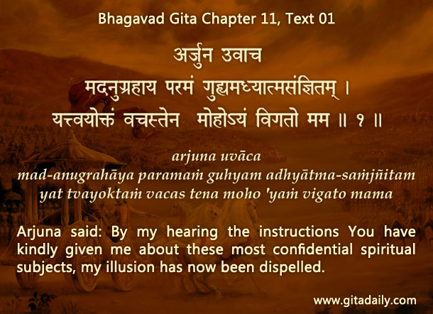 Yet this admission doesn’t dampen Arjuna’s eagerness to know more about Krishna, as is evident in his request (10.16) that Krishna speak his glories in detail. After hearing those glories in the tenth chapter, Arjuna states (11.01) that Krishna’s merciful words have dispelled his illusion.