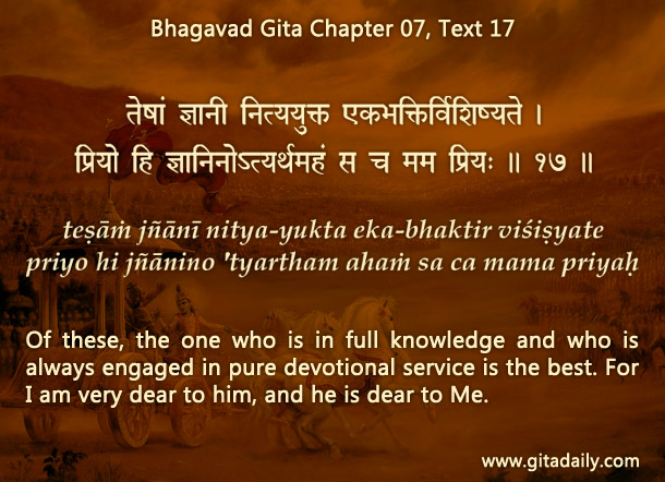 Among them, the Gita (07.17) states that the best are the knowledgeable, specifically those whose knowledge inspires them towards one-pointed devotion. Why are they the best? Because they approach Krishna not for what he provides but for who he is – the all-attractive, all-loving supreme person. The ultimate fulfillment is found in lovingly connecting with him and living in his sweet presence. Because the devotion of the knowledgeable doesn’t depend on getting something, it stays sublimely steady.