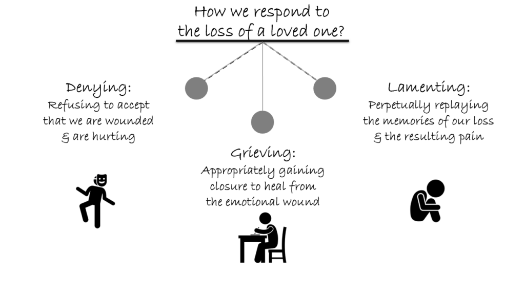 If we consider the responses to such a loss in the form of a pendulum, one extreme would be denying, wherein we refuse to acknowledge that we are wounded and are in pain. (This denial is different from the denial of refusing to accept that the deceased has actually passed away.)