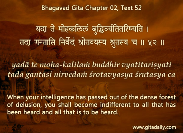 02.52: When your intelligence has passed out of the dense forest of delusion, you shall become indifferent to all that has been heard and all that is to be heard.