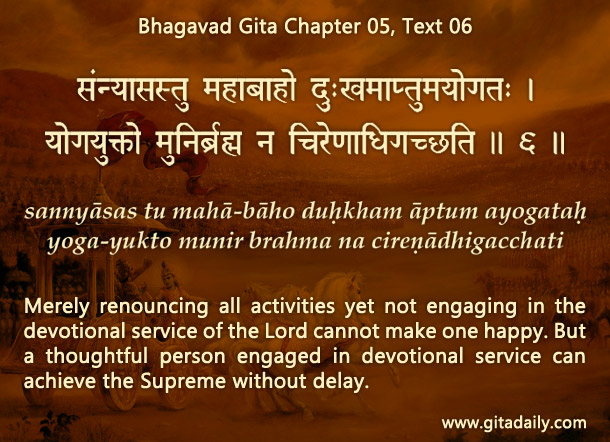 05.06: Merely renouncing all activities yet not engaging in the devotional service of the Lord cannot make one happy. But a thoughtful person engaged in devotional service can achieve the Supreme without delay.