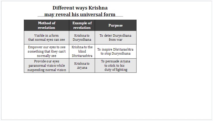 In contrast, Krishna’s revelation of the universal form in the Kuru assembly seems to fall in the first category. That revelation was seen not just by Duryodhana but also by everyone in the Kuru assembly.