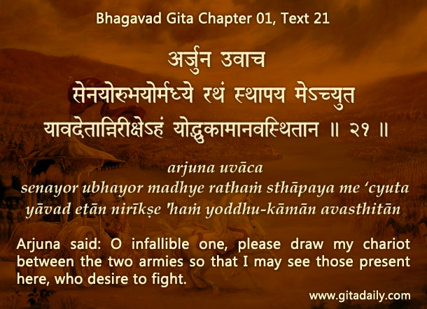 01.21: Please draw my chariot between the two armies so that I may see those present here, who desire to fight.